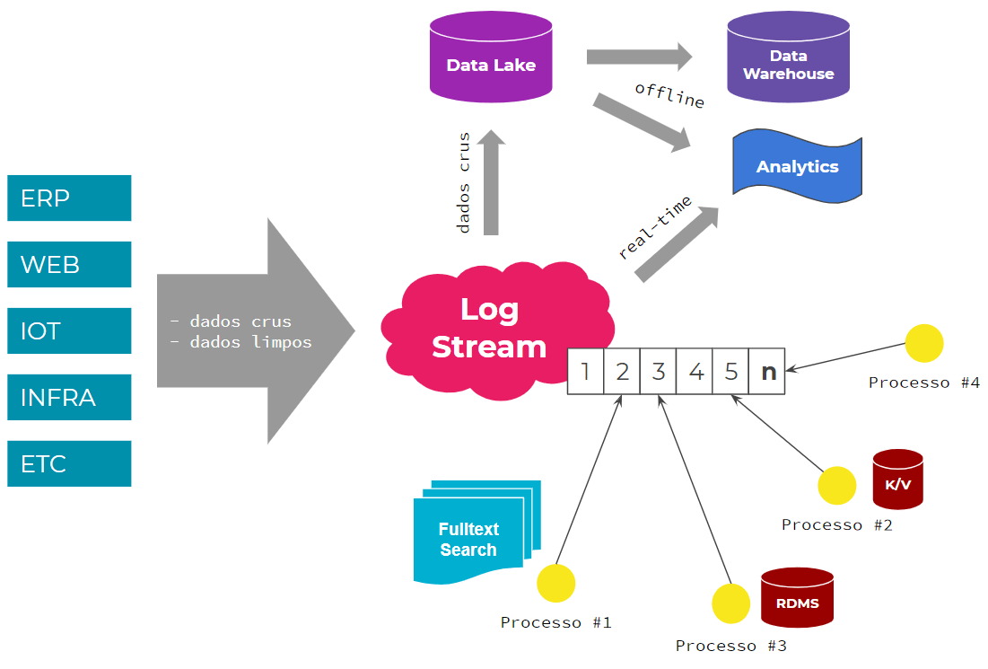 Arquiteturas desta natureza tem o log stream como canal de entrada de dados para um contexto onde possam ser conhecidos, usados e manipulados por diversos sistemas e aplicações de um ecossistema.