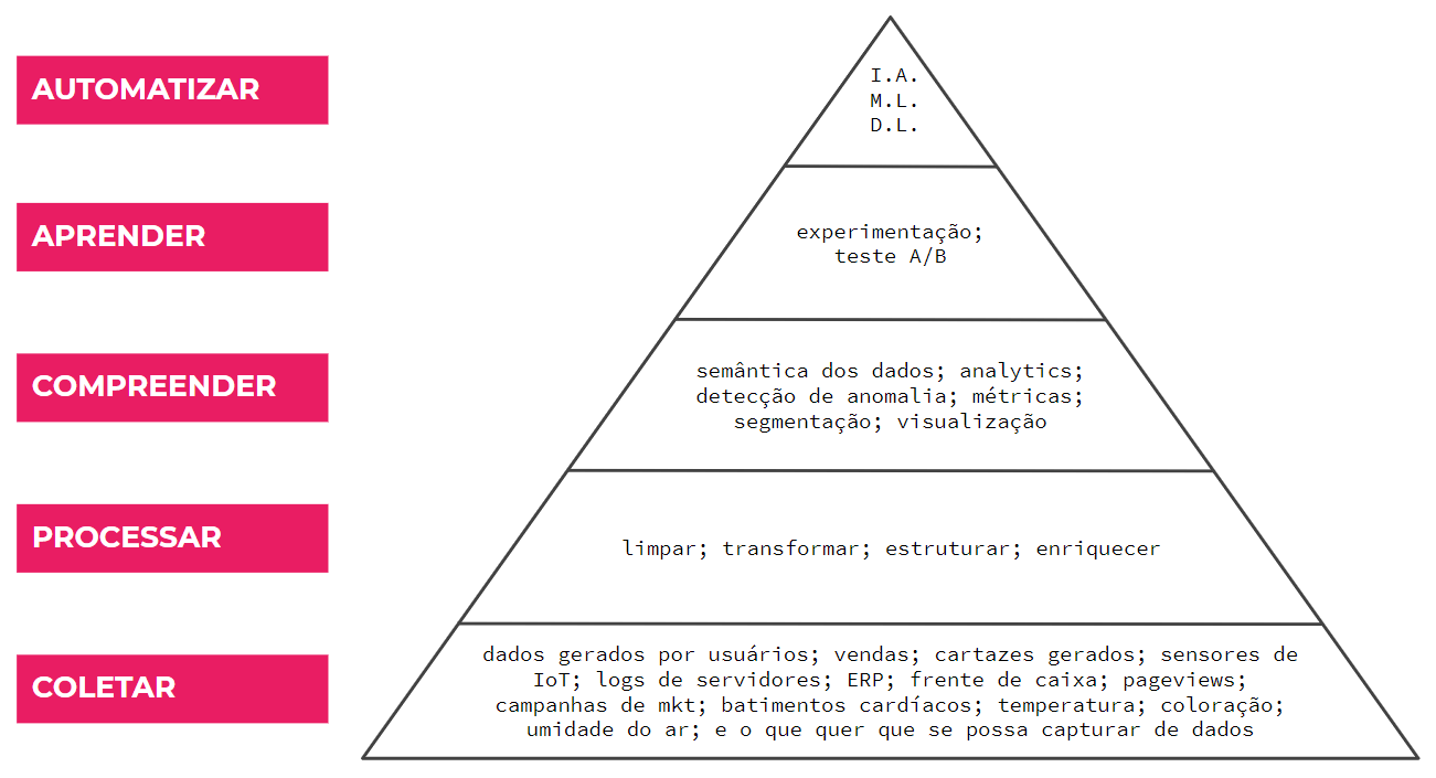 E enquanto vemos que muito se fala de inteligência artificial, machine learning, deep learning, etc, pouco ainda se discute sobre o fundamental, sobre a base da pirâmite: coletar dados de maneira consistente, confiável e que permita escalar a pirâmide com segurança. Ou pelo menos, com mais segurança do que nenhuma segurança.