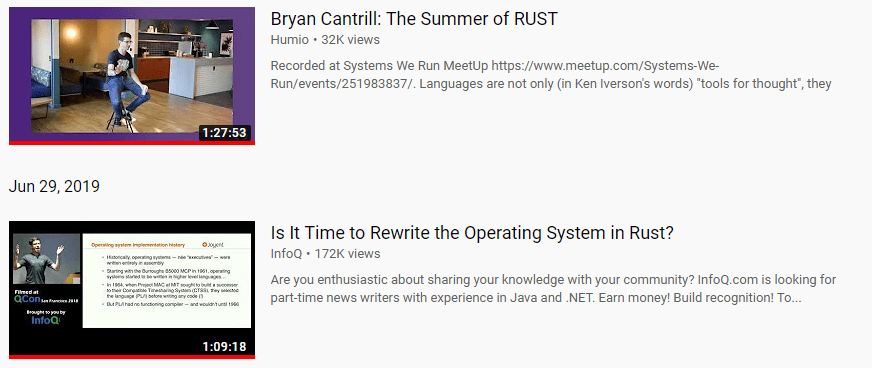 Desde março de 2018, eu vinha vendo uma coisa aqui, outra ali, sobre a linguagem Rust, após ter visto a apresentação do Florian Gilcher na GOTO 2017, intitulada “Why is Rust successful?”, mas nada realmente sério. Me lembro de ter ficado especialmente empolgado com duas talks do Bryan Cantrill, uma na QCon 2018, “Is it Time to Rewrite the Operating System in Rust?”, em junho de 2019, e outra em um meet up, “The Summer of Rust”, alguns dias depois, mas ainda assim, nada de pegar um livro para ler, de rabiscar algum código.