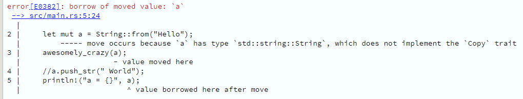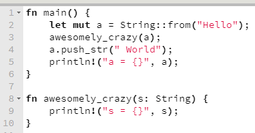 No nosso caso, somente a variável a era dona do valor "Hello" até ter transferido sua posse para a função awesomely_crazy. A partir de então, a função awesomely_crazy (nominalmente o parâmetro s) é quem passou a ser sua única proprietária; e ao final de sua execução, ao término de seu escopo, esse valor será destruído. É por isso que ele não pode ser emprestado novamente para modificação, através de a.push_str, ou mesmo emprestada para println!, que sequer modifica alguma coisa.