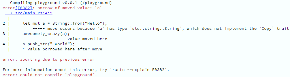 O compilador logo chia, dizendo que se está tentando emprestar o valor supostamente possuído pela variável a, para poder modificá-lo, enquanto este, na verdade, teve sua posse transferida para a função awesomely_crazy. Ou seja, o que quer que awesomely_crazy faça com o que recebeu, a variável a não tem mais nada a ver com isso.