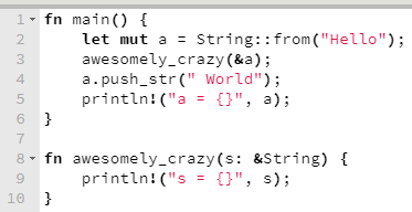 Portanto, se quisessemos fazer esse código compilar, teríamos que modificar a implementação da função awesomely_crazy, de modo que ela passasse a tomar o valor da variável a emprestado, por referência (& – C/C++ feelings, anybody else?), e não por posse.