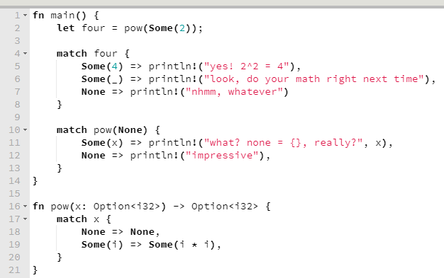 Quem me conhece e já trocou ideias de programação comigo, sabe que sou bem fã de pattern matching. Essa é uma das coisas que mais gosto em Erlang e é também uma das que mais gosto em Rust.
