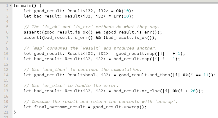 Okay. Mas voltando à Result e ao tratamento de erros, expandindo um pouco no exemplo acima, retirado da própria documentação, perceba que há uma série de funções bacanas, incluindo map e or_else.