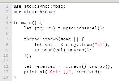 Este é um exemplo simples de message passing que peguei emprestado de Klabnik & Nichols. Bem semelhante ao que se tem em Go, por exemplo, porém um tanto mais verboso.