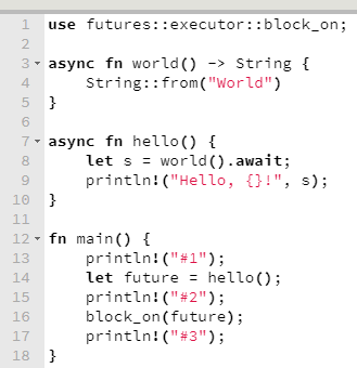 Já este exemplo abaixo é de concorrência com futures, usando a relativamente nova implementação de async/await, que também segue a filosofia de abstração com custo zero. Acho que este modelo dispensa qualquer introdução, por ter se popularizado tanto nos últimos anos, desde que foi implementado em F# e C# e mais recentemente em JavaScript.
