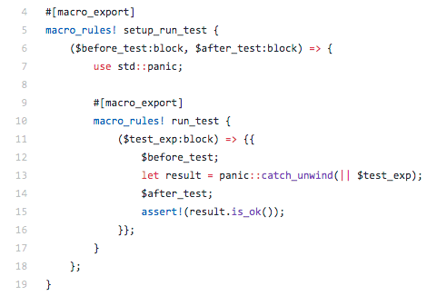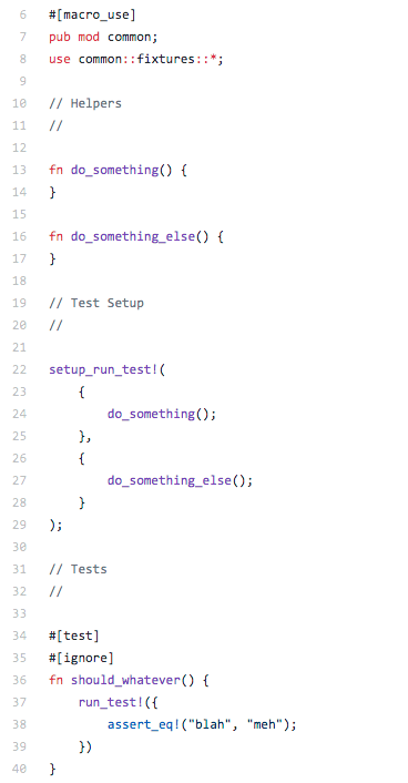 A despeito destas macros terem dado um bom adianto, para eu não ter que escrever do_something(); e do_something_else(); em todos os meus casos de teste (que por enquanto nem são tantos, para ser franco), isto ainda me pareceu muito trabalho ter que fazer setup dos blocos before e after e depois usar a macro run_test! em cada caso de teste.
