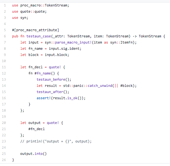 O que esta macro procedural faz é extrair o bloco de código de uma função de testes e sanduichar ele com chamadas às funções testaun_before e testaun_after. Na prática, o mesmo que a macro run_test! que mostrei anteriormente.