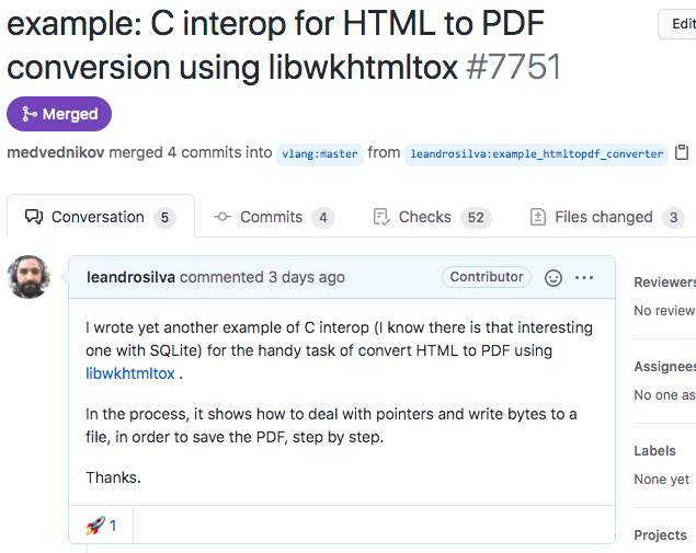 O que eu fiz para ajudar? Escrevi um exemplo de interop com C para converter HTML em PDF usando libwkhtmltox e mandei um PR para os mantenedores da linguagem incluírem no repo oficial.